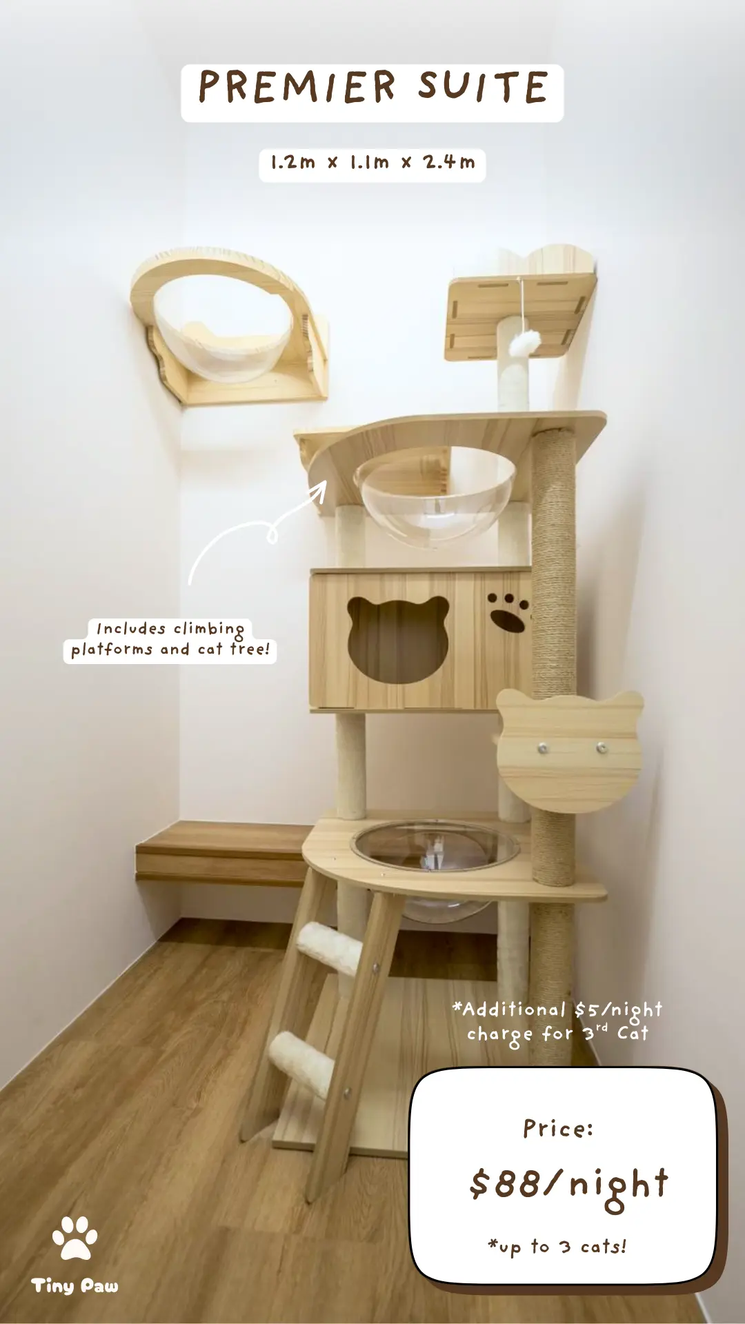 - Amenities: 15 to 30 minutes of free access to Tiny Paw Fitness Centre, 24-hour air conditioning, 24-hour CCTV monitoring, Cat trees with scratch poles, Climbing platforms, Daily housekeeping, Feeding and drinking bowls, Individual spaces for each suite, Scratch board, Twice daily room service