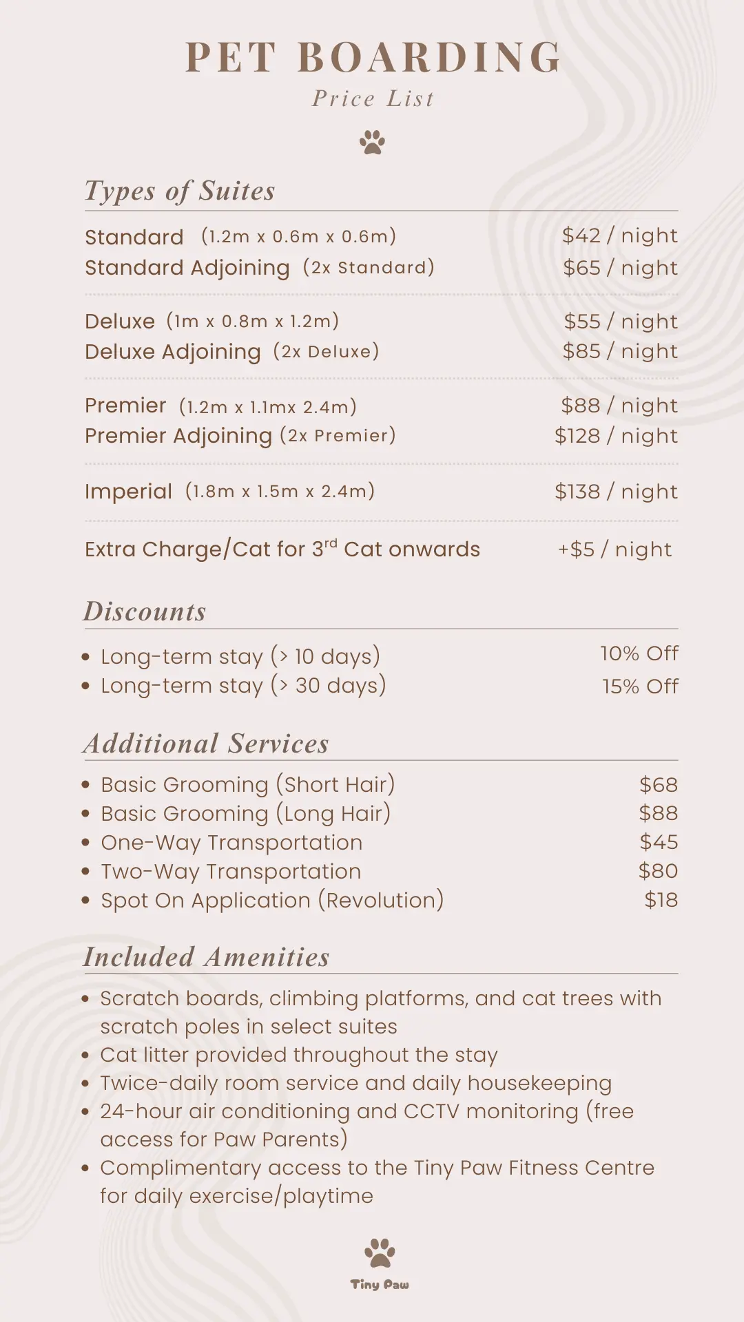 | 3rd Cat Onwards | ⚪ Not applicable | ⚪ Not applicable | ➕ $5 / night / cat | ➕ $5 / night / cat |